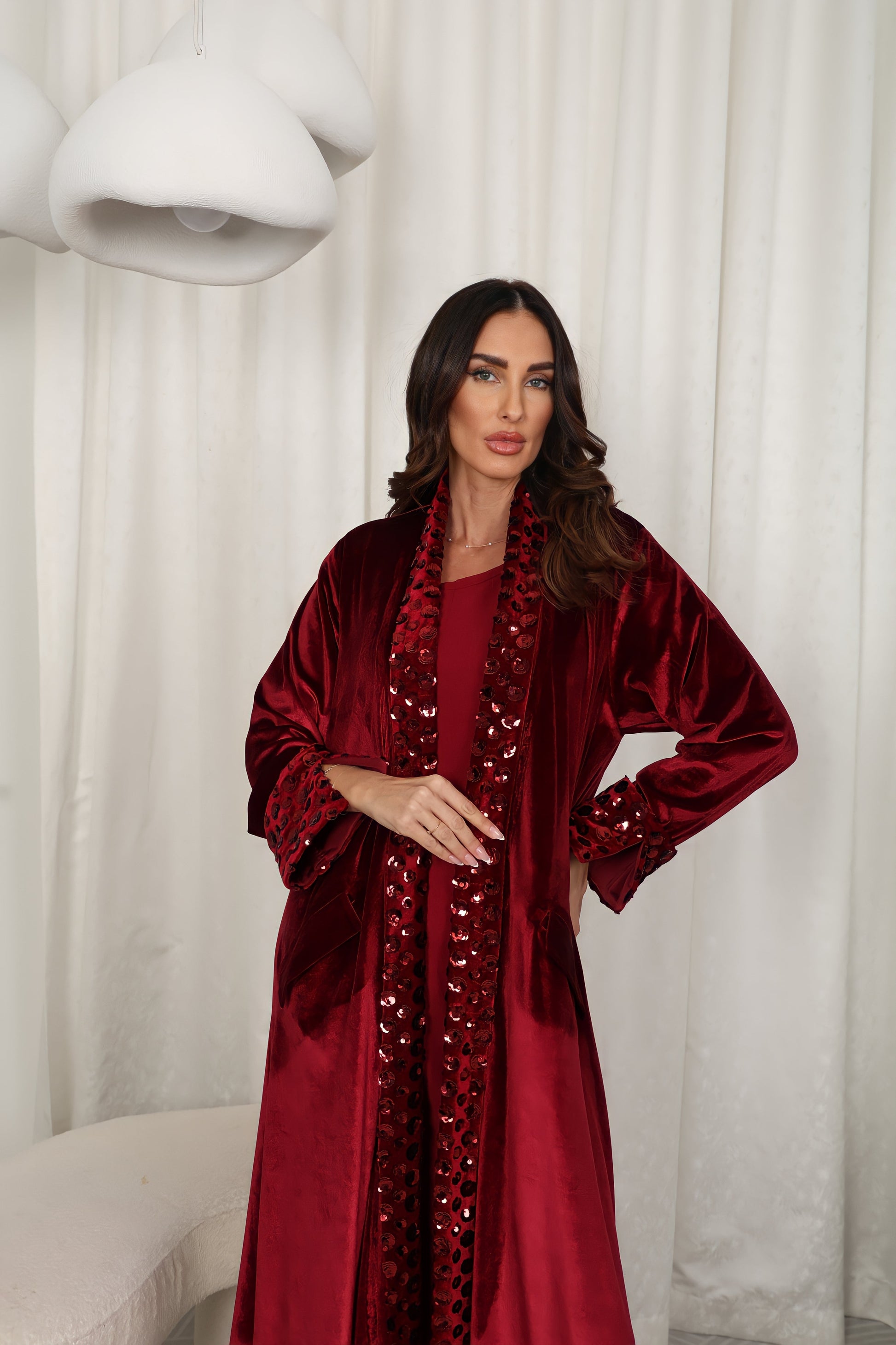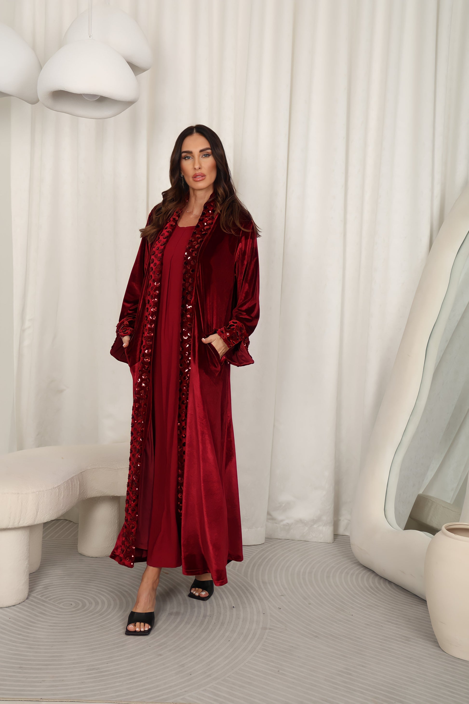Step into timeless elegance with the Burgundy Velvet With Flowers Sequence Embroidery Design by Brokar Abaya. Crafted with luxurious fabric and adorned with exquisite details, this abaya is a perfect fusion of tradition and sophistication. Featuring abaya – burgundy velvet with flowers sequence embroidery design, impressive and elegant look, it is ideal for formal gatherings, festive occasions, or adding a touch of luxury to everyday wear.