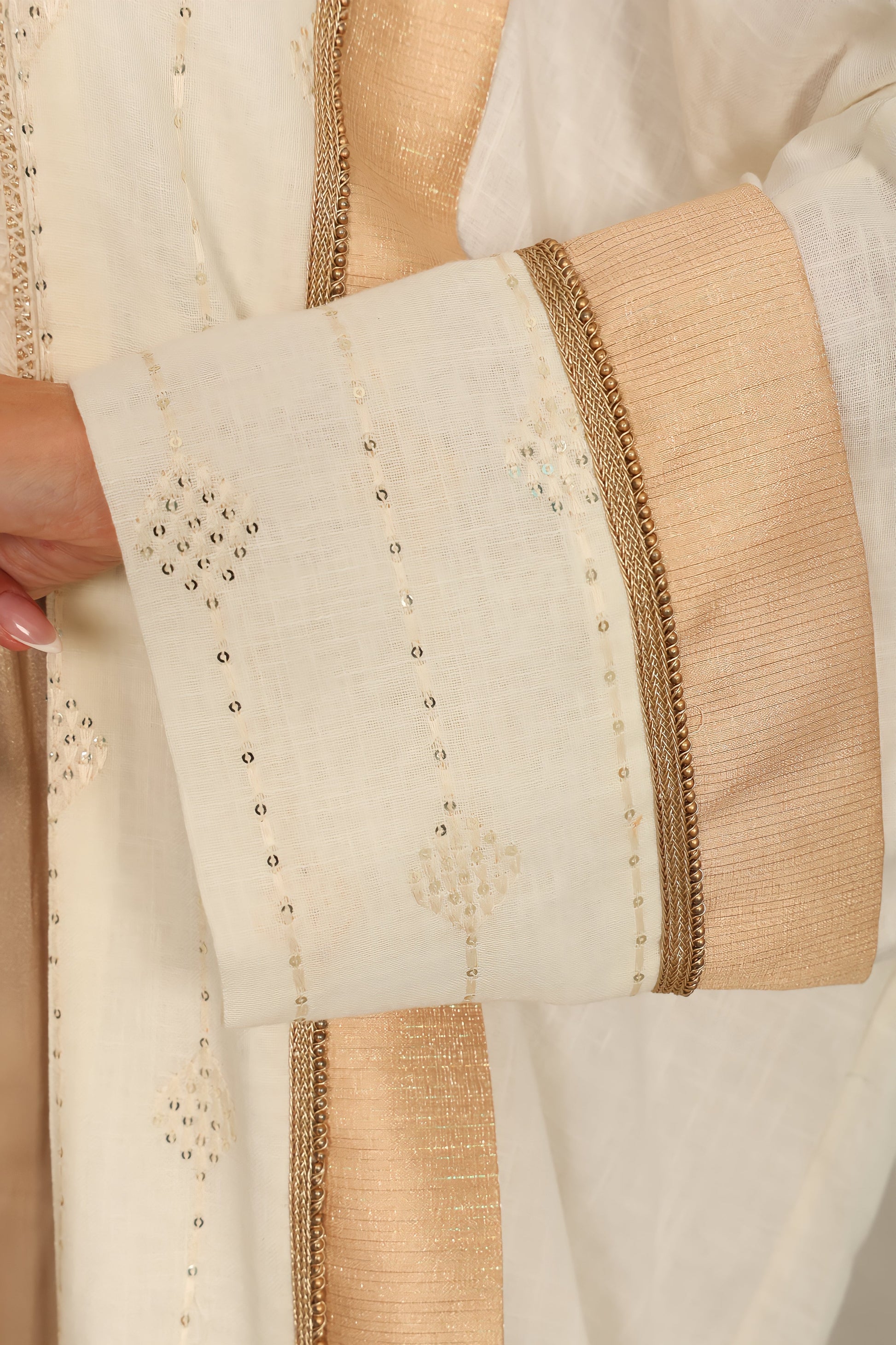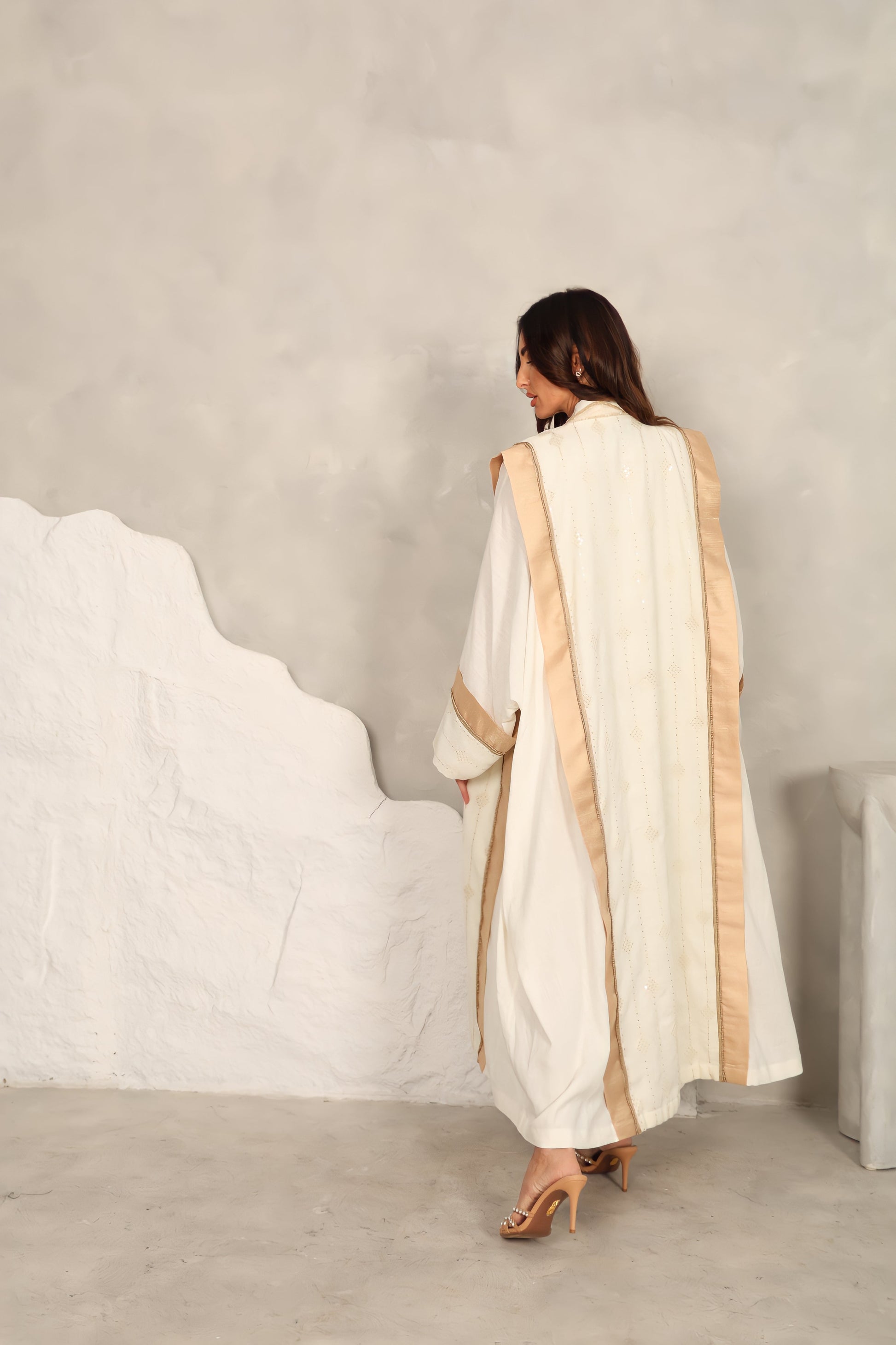 Off White Linen Emrodrodered Abaya by Brokar Abaya showcases elegant design and intricate detail. Off White Linen Embroidered Abaya – Off White Design is crafted from luxurious shiny crepe and embroidered chiffon, offering a refined balance between comfort and elegance. The design features open pink crepe abaya embellished with handmade embroidered chiffon, brought to life in a palette of pink. Tailored in a free size silhouette, it moves fluidly and flatters a variety of body types. It is accompanied by a matching nan to complete the ensemble. Versatile enough for both everyday sophistication and elevated occasions, this piece blends tradition with a modern edge in every detail.