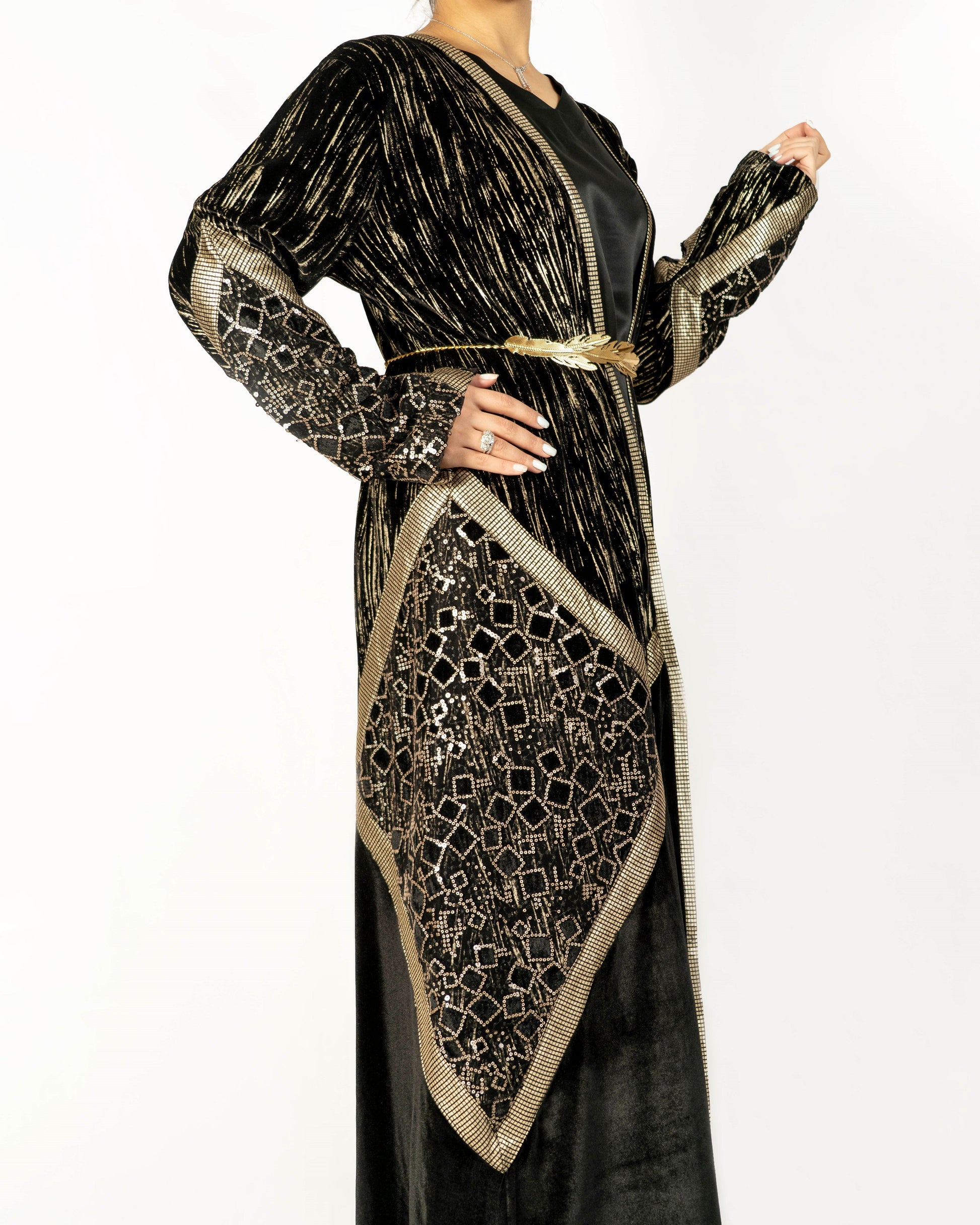 Black Velvet Abaya Designed With Multi Fabrics And Sequence is made from premium velvet, showcasing Open black velvet abaya with different kinds of velvet and gold metalic fabric in a rich black hue. The m-l silhouette adds effortless flow and elegance. Paired with a matching nan, it completes the look. Suitable for night gatherings and elegant events, blending luxury with grace.
