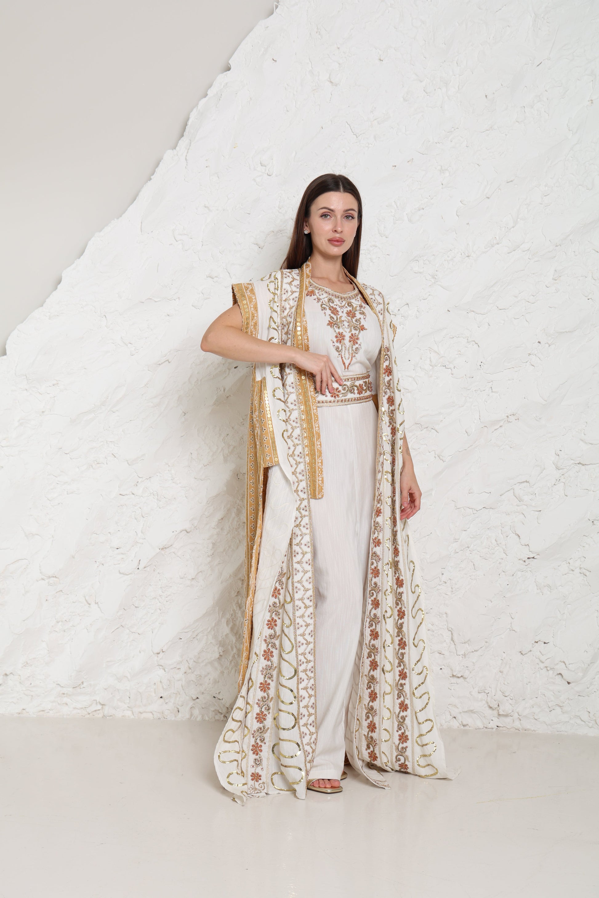 For occasions that call for soft shine and relaxed elegance, this off white with gold accents abaya offers a balanced look that feels comfortable and refined. The regular silhouette and maxi length create an easy flow suited to special occasion, evening wear and ramadan.