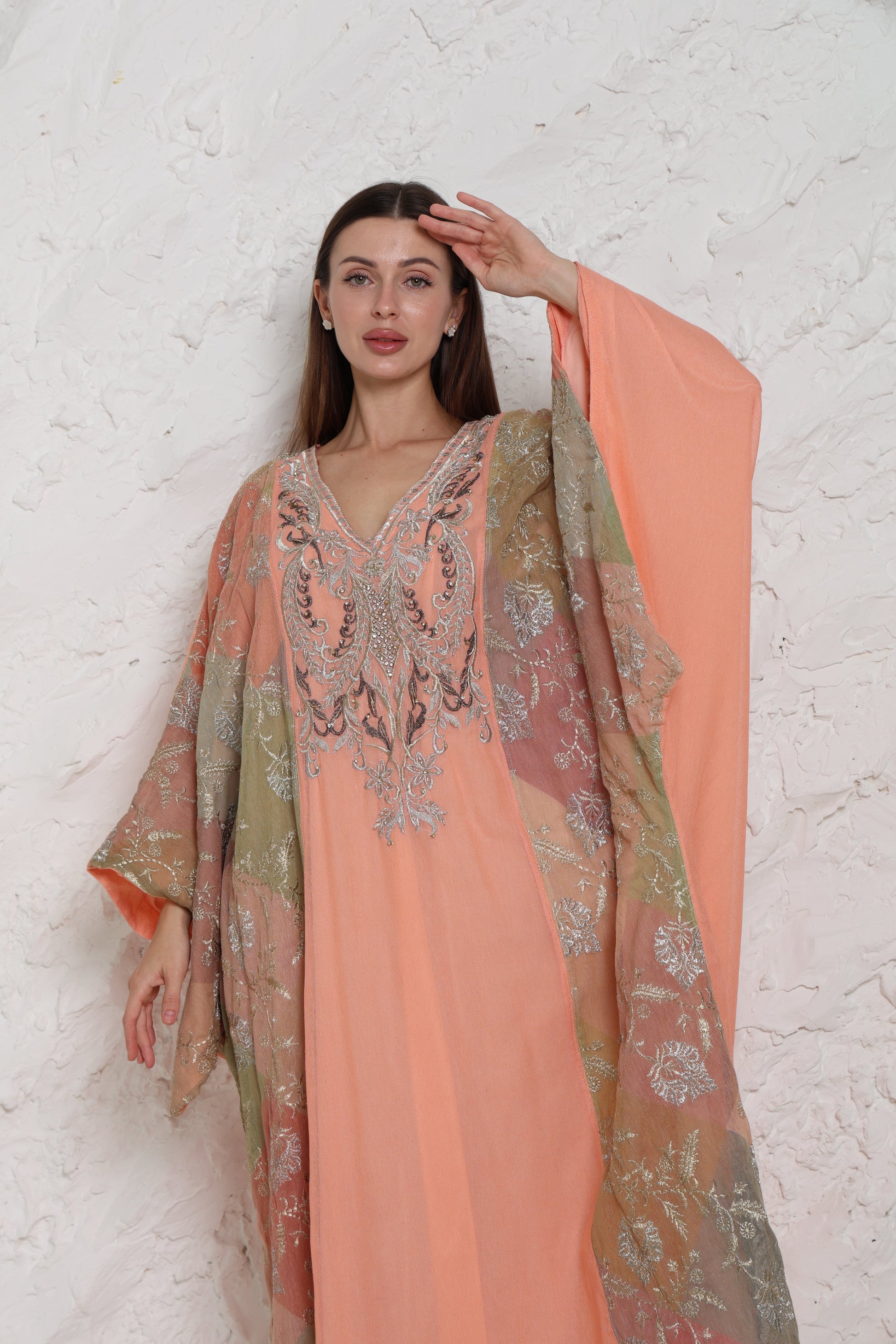 For occasions that call for soft shine and relaxed elegance, this peach kaftan offers a balanced look that feels comfortable and refined. The relaxed silhouette and maxi length create an easy flow suited to special occasion, evening wear and ramadan.