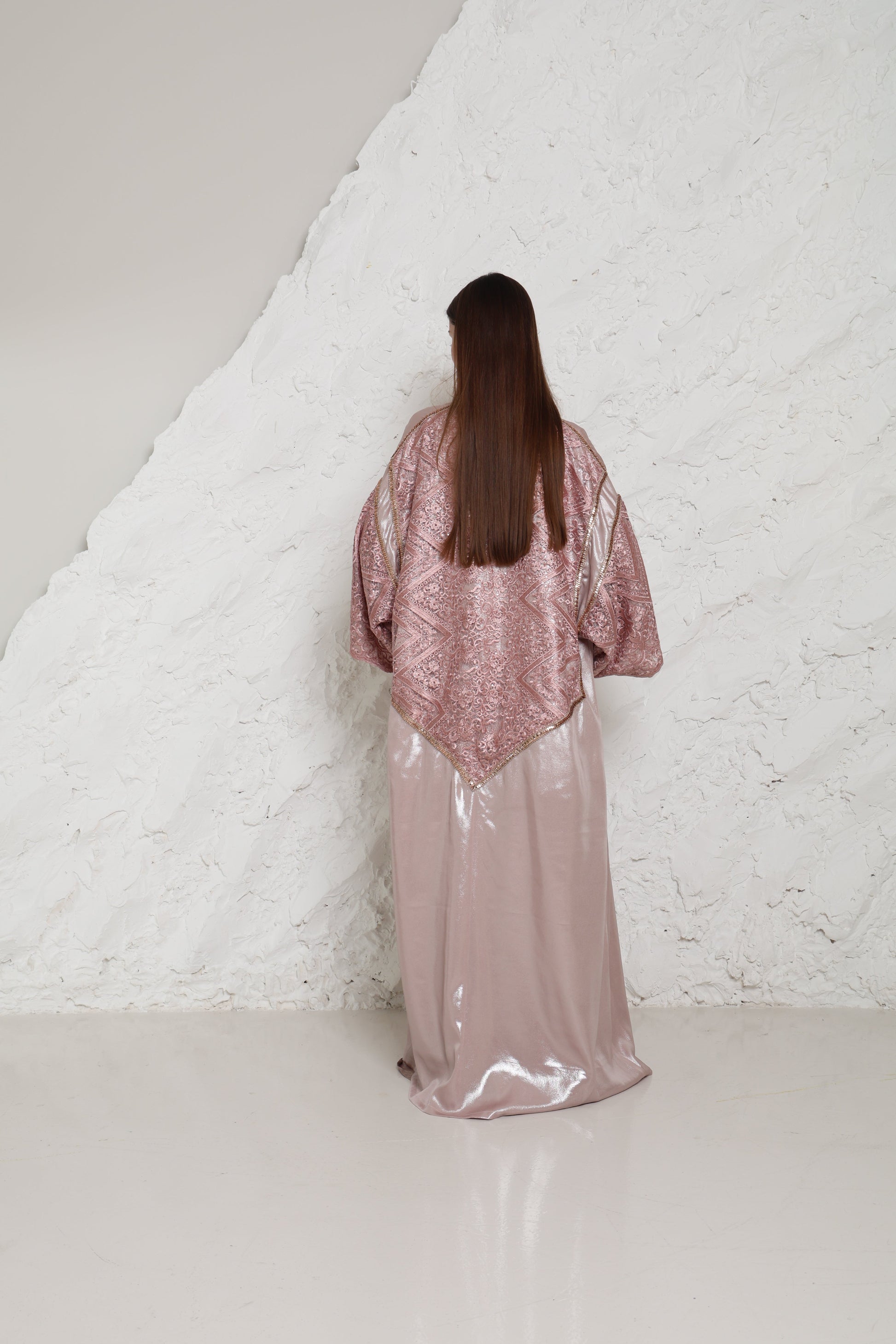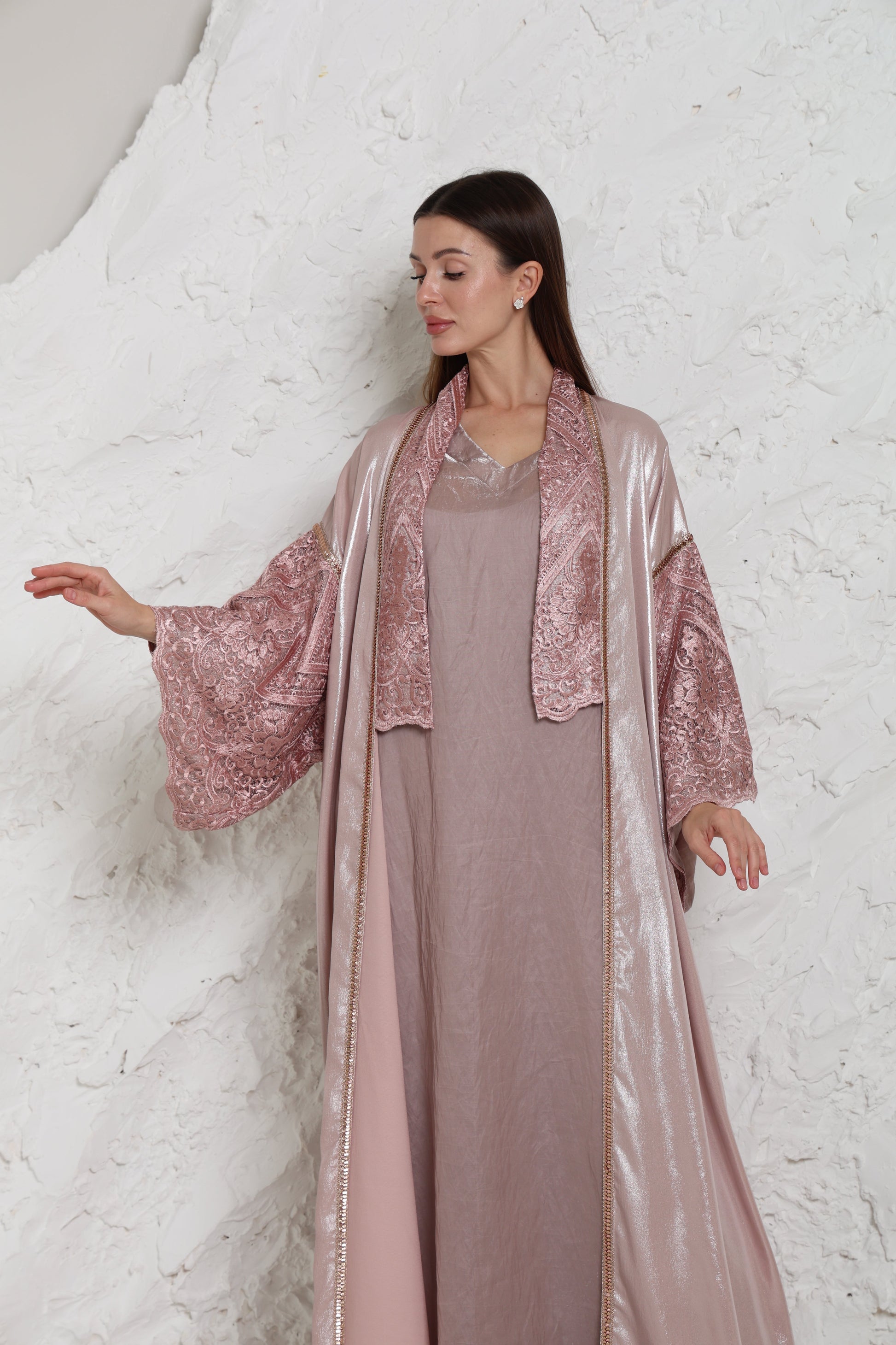 Made for women who prefer a clean, polished look, this Pink with rose gold accents abaya offers a balanced look that feels comfortable and refined. The relaxed silhouette and maxi length create an easy flow suited to special occasion, evening wear and ramadan.
