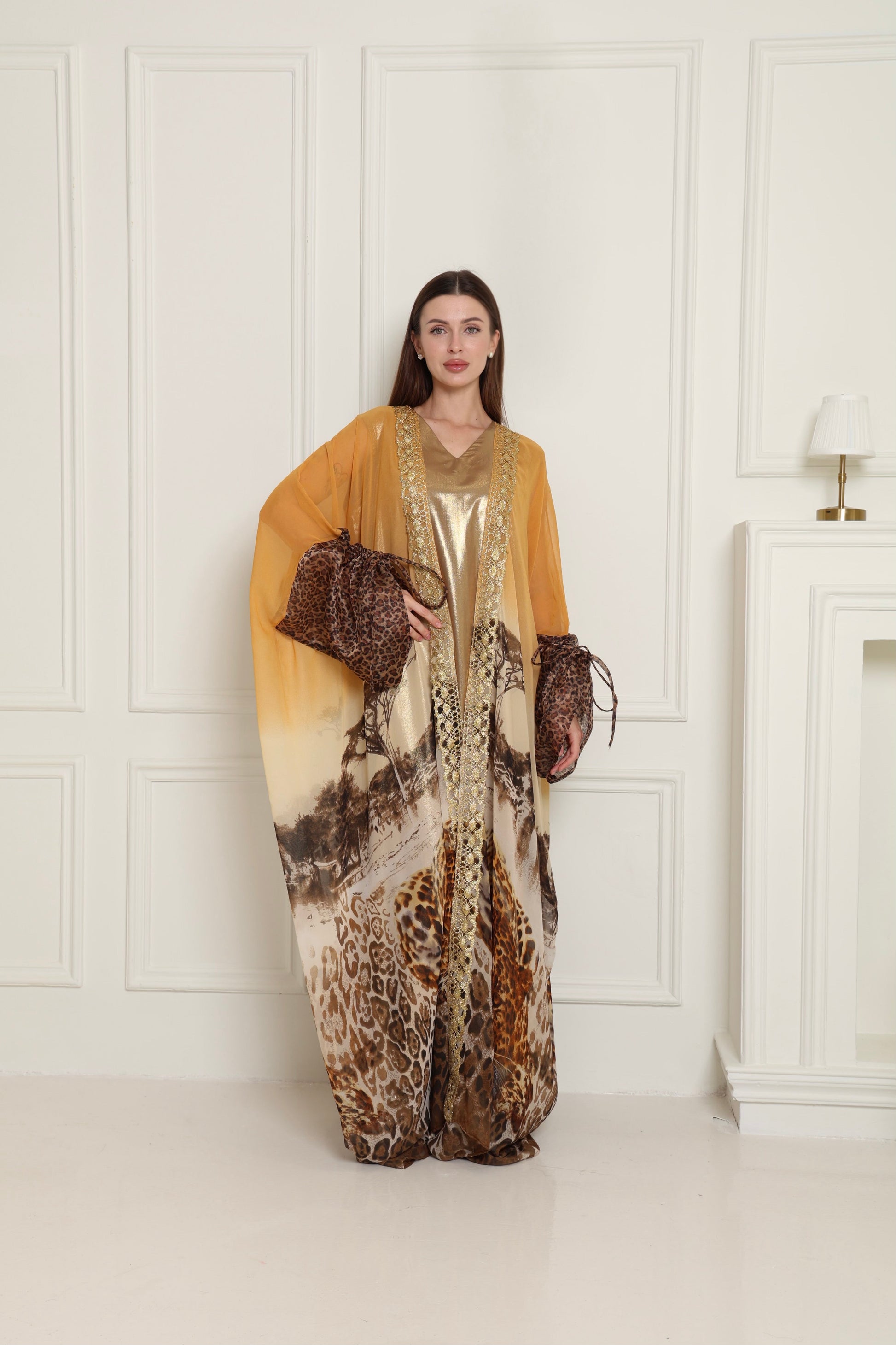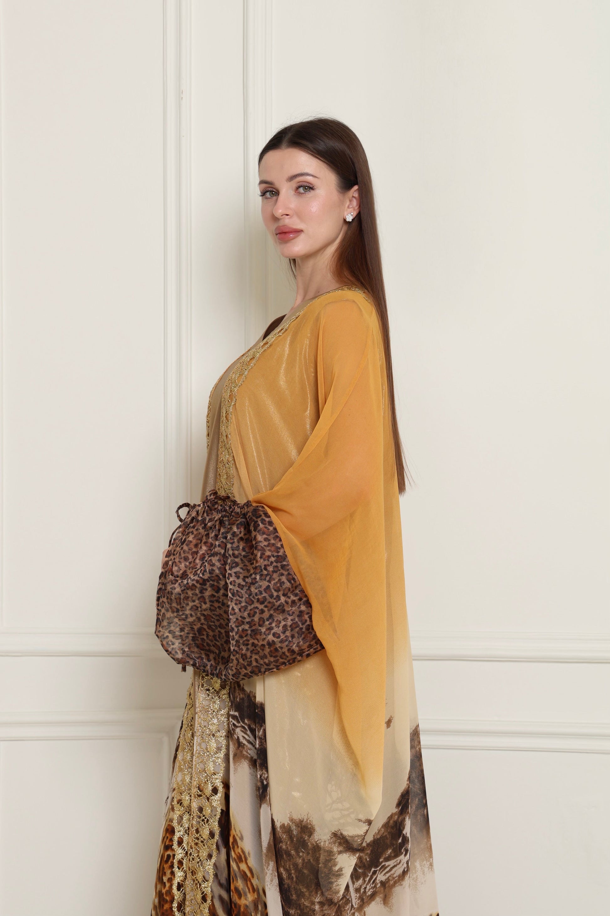 Designed for nights when you want to feel confident and comfortable, this tiger with peach accents abaya gives you a refined look that still feels easy to wear. The loose silhouette and maxi length create a graceful flow that suits special occasion, daily wear, evening wear and ramadan.